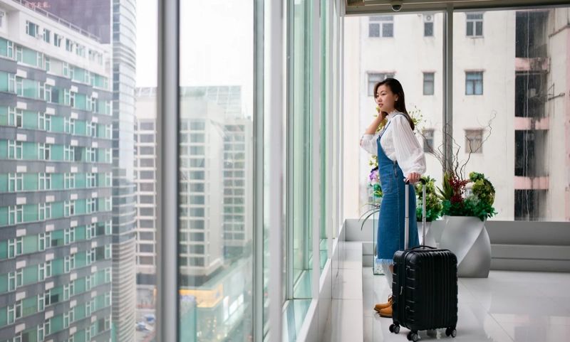 • A woman with a suitcase looking out a window