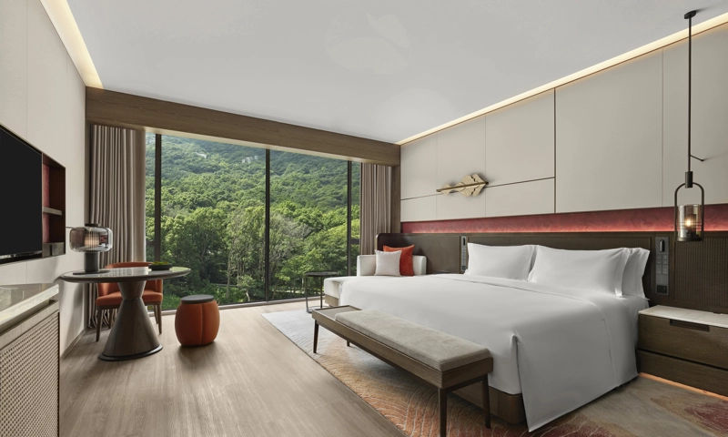 Homm Wenzhou Nanxijiang is located between the Yandang Mountains and the Nanxi River. The hotel includes 100 rooms and suites, with 20 family-friendly layouts. A central feature of the property is a hot spring complex with 26 pools. The hotel emphasizes sustainability and community engagement, reflected in its design and guest experiences. Activities available to guests include hiking, cycling, and seasonal fruit picking. Dining options focus on local produce and seasonal ingredients.