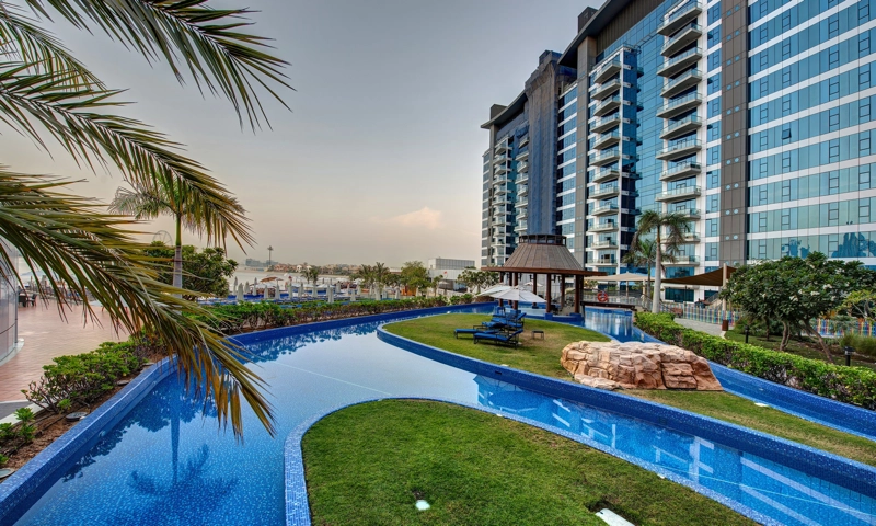 The property comprises diverse room and suite options, and the serviced apartments include studio, one-bedroom, and two-bedroom layouts. Guests can access six dining venues, a private beach, an infinity pool, a lazy river, and comprehensive wellness and family-friendly facilities.