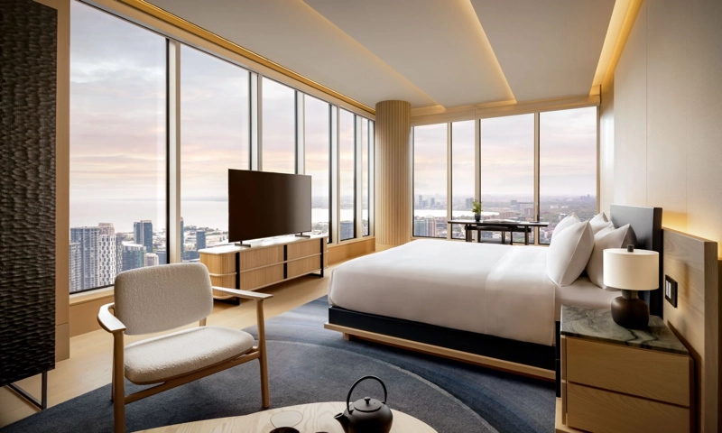 The hotel features 36 rooms and suites, each designed with natural materials and subtle Japanese influences. The rooms have floor-to-ceiling windows, offering guests expansive views of Toronto’s landmarks. Notable amenities in the rooms include Japanese deep-soaking tubs positioned next to the windows, heated floors, and high-end appliances from brands like Byredo and Dyson.