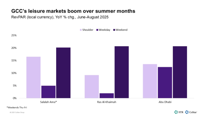 Leisure demand is the second major factor driving RevPAR growth in 2025. Summer weekends across the three markets have shown significant RevPAR growth as both short- and long-haul demand have increased. Destinations like Salalah and Ras Al-Khaimah have successfully attracted regional drive-to demand.