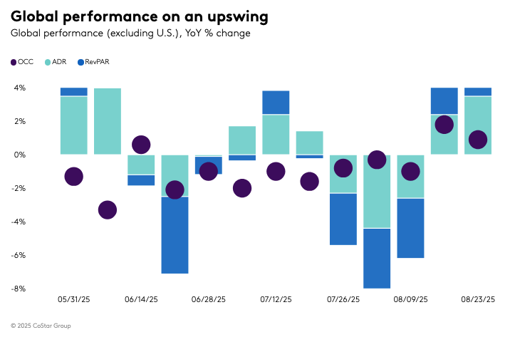 In the week ending August 23, 2025, the U.S. hotel industry experienced a 1.3% decrease in revenue per available room (RevPAR), marking the third consecutive week of decline and the tenth drop in the past twelve weeks. The downturn was primarily driven by a decrease in occupancy, accompanied by a slight decline in the average daily rate (ADR) of 0.2%. The Top 25 Markets were largely responsible for this decline, with a RevPAR drop of 3.8%, while all other markets saw a modest increase of 0.4%.